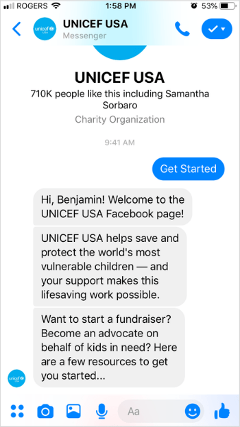 UNICEF USA is the perfect example for building brand awareness. You can customize a greeting message when someone interacts with your bot on messenger for the first time. This is just one of the many ways that bots can be used to inform your audience about what your organisation do, who you are and collect information on what your audience may care about.